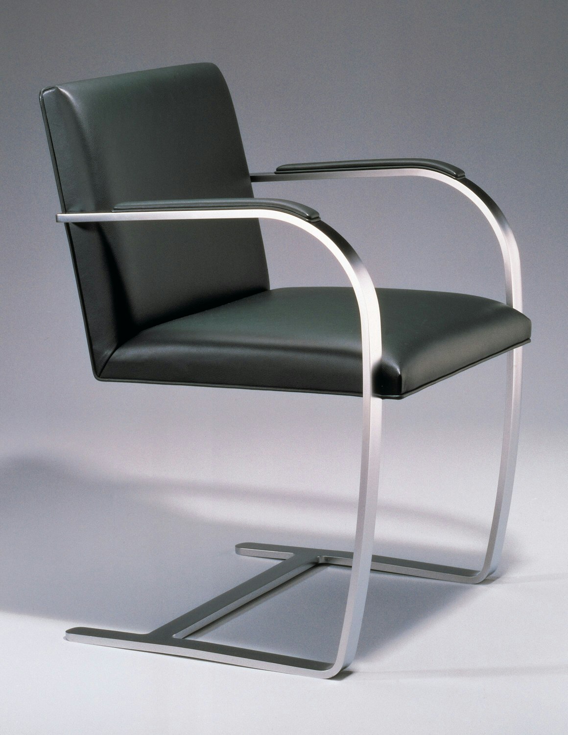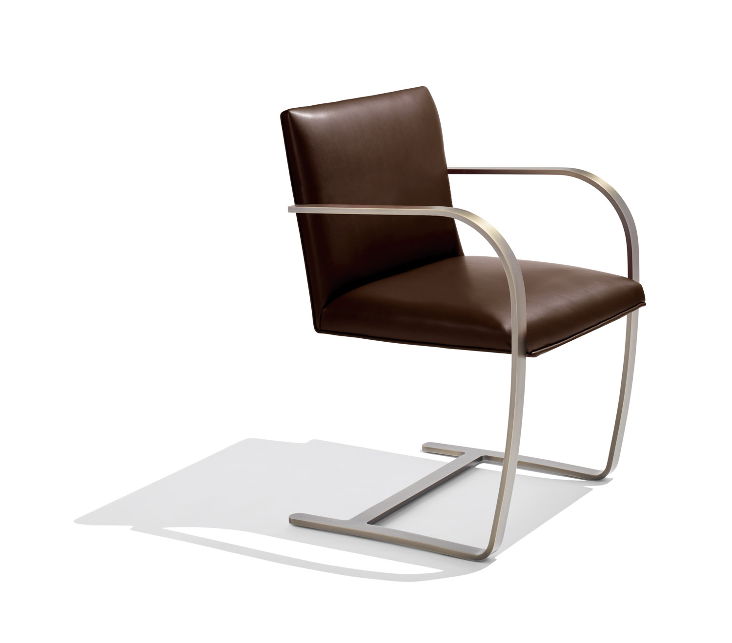 The Brno Chair with Flat Bar Frame is available with or without arm pads, and in a choice of polished chrome, polished stainless steel, antiqued bronze, or matte onyx finish.