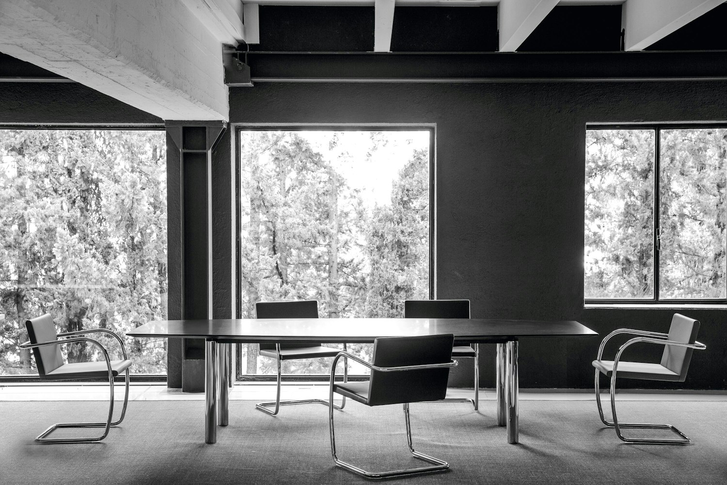 Mies designed the villa’s furniture, including the Tugendhat and Brno Chairs. Up to 24 tubular-frame Brno Chairs were used throughout the home at dining tables, desks, side tables, and vanities. The original design had a thin cushion, but in 1958 Mies approved a thicker version when Philip Johnson selected the chair for the Four Seasons restaurant in the Seagram Building. As Eric Larrabee noted in Knoll Design, it was Mies himself who proposed the Brno Chair as the restaurant’s primary seating.