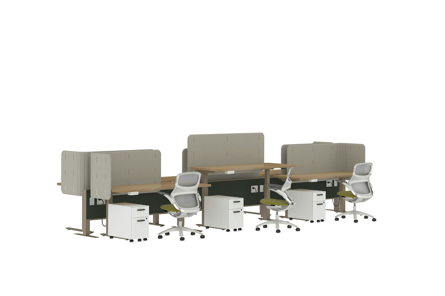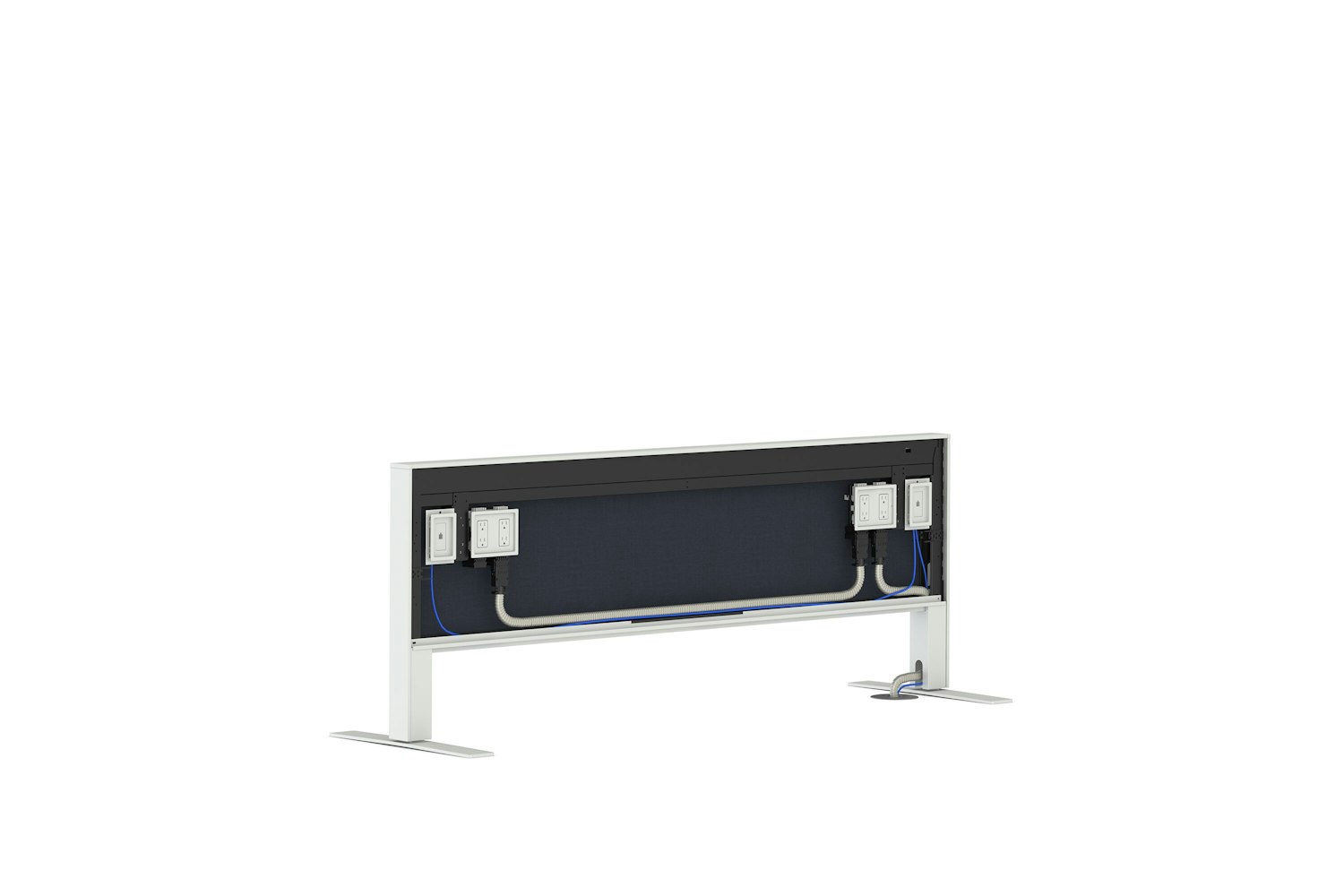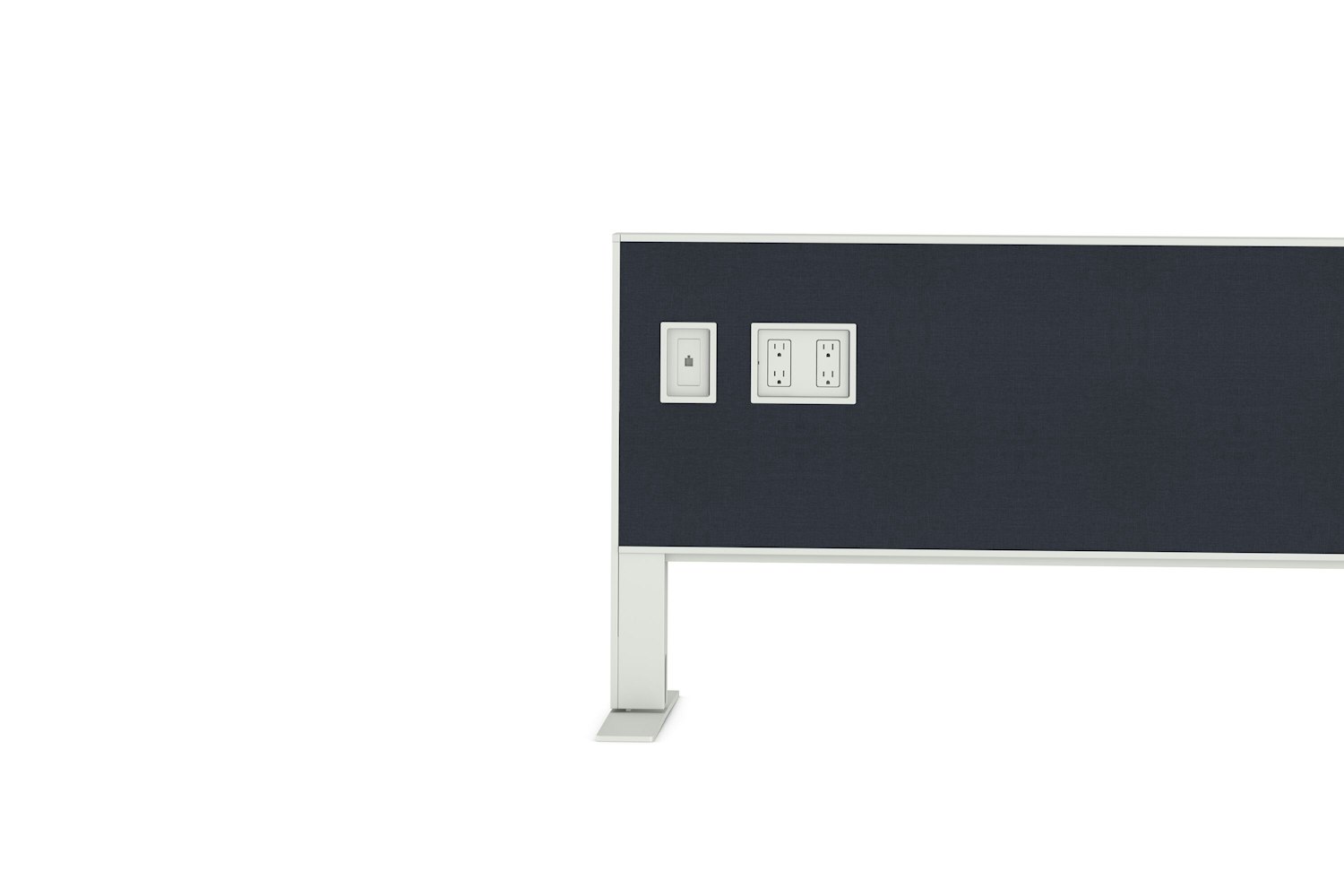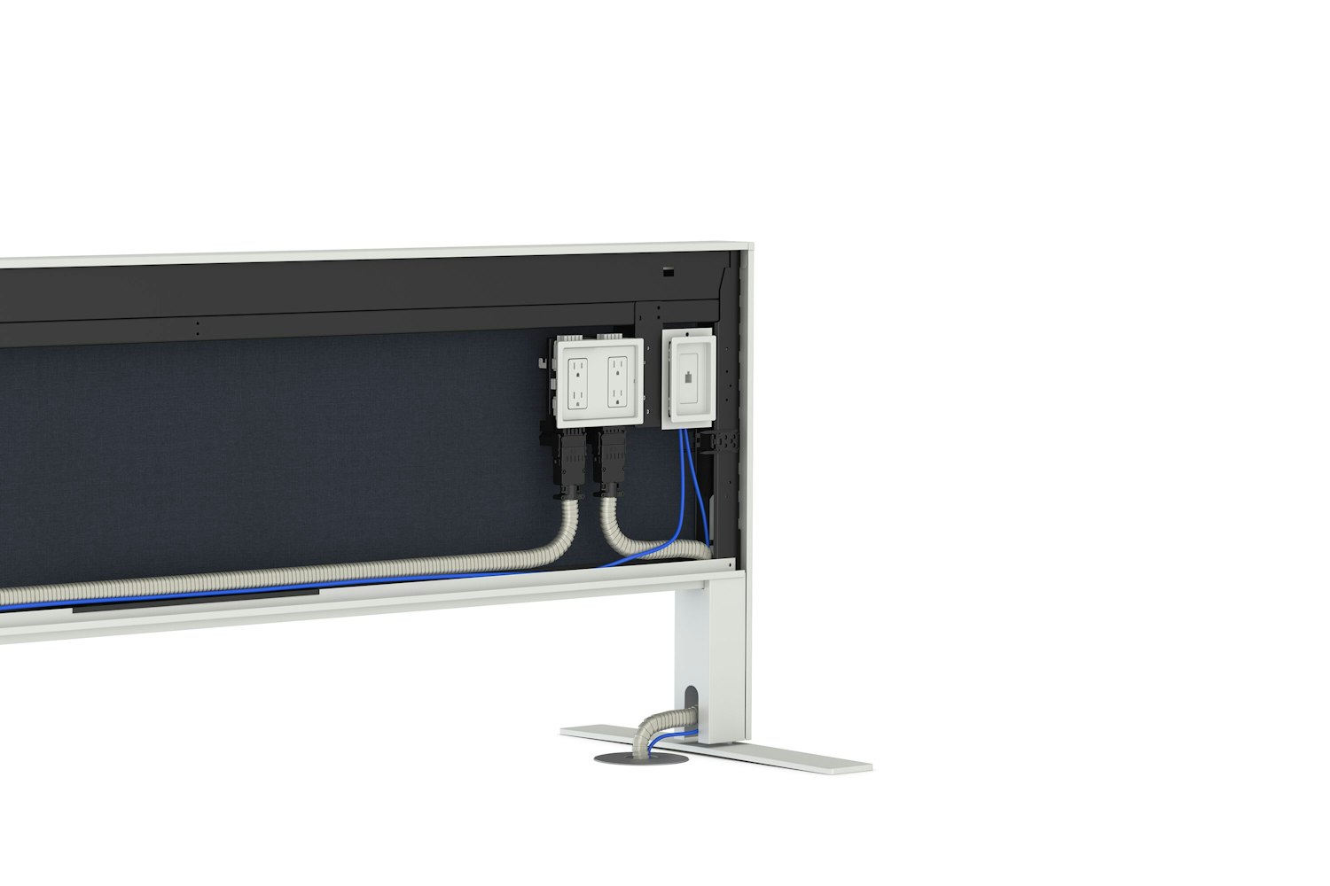 The Elevated Spine sits off the floor and is suitable for straight planning or 90 degree planning with gallery panels. This panel-based technology spine provides flexible power and data capability and can be linked to connect multiple workstations. The elevated design has a light aesthetic, and because the bottom of the spine is open, power can enter anywhere along the lower rail.