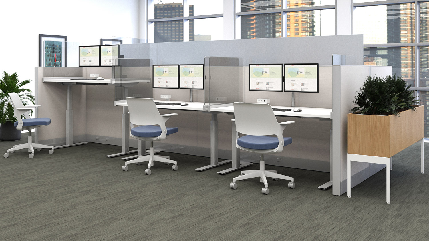 End and Intermediate Screens plan at the end of a desk or are shared between adjacent users to delineate individual workspaces. End Screens feature a bracket that clamps to the front and back edges of the top for easy removal or reconfiguration.