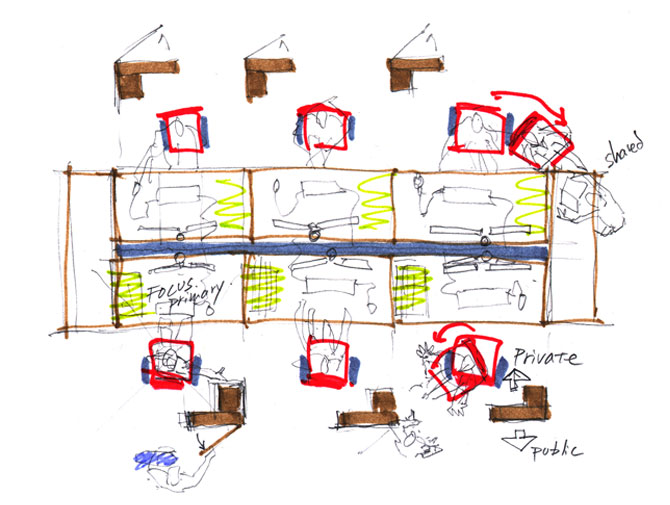 Whether in an office, at home or in a coffee shop, work today requires shifting from one task and type of work to another – from focused projects to shared and team activities. The distinct modes of work should be supported by a set of nimble elements that simplify transitions from individual to group work.