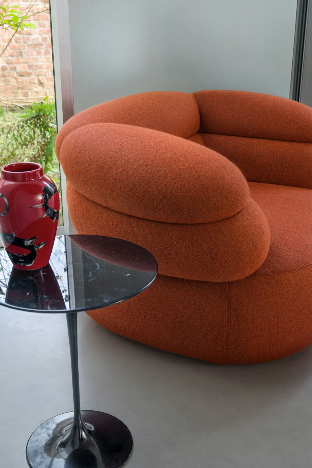 The Biboni Lounge Chair welcomes the human form with puffy folds precisely placed to envelop and embrace the sitter. It’s both soft and supportive, holding the body in a relaxed yet upright position.