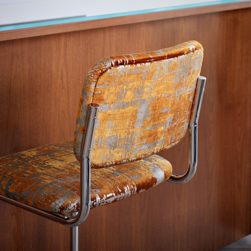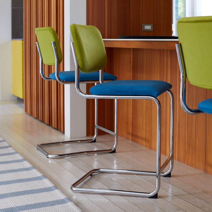 After completing the Wassily, Breuer felt that the potential grace of the material was not yet fully exploited. The Wassily design was very much influenced by the constructivist theories of the Dutch De Stjil movement. A familiar form — in this case the classic club chair — reduced to its elemental lines and planes. The result was an overlapping, dense arrangement of leather and tubing. For the Cesca chairs Breuer sought to better celebrate the new material. An attempt to reduce visual noise led him to the continuous line of steel supporting a cantilevered seat — one of the most copied concepts in 20th century furniture.