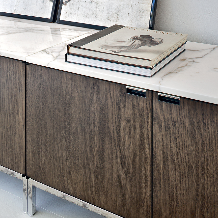 To execute this new layout, Florence introduced the 2544 Credenza in 1961. The elegant design exuded executive quality, and clearly exhibited Mies van der Rohe’s impact on Florence’s approach to design. Design historian Bobbye Tigerman notes that, “the furniture is architecture miniaturized…The structure of a large case balanced on thin peripheral columns recalls Mies’ Seagram Building.” Like Mies, Florence Knoll would endlessly refine each detail of a design in order to achieve simple, seemingly effortless beauty.