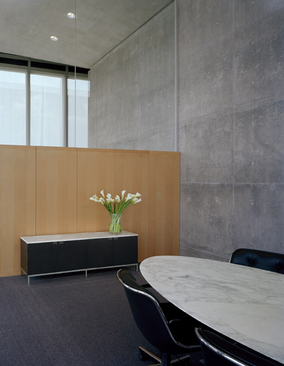 Seeking to create a space better suited to the executive’s primary function — communication — Florence reconsidered the layout from an architectural perspective. She replaced an imposing, diagonal desk with the more inviting table desk, placed parallel to the back wall. Storage was moved to behind the table in a low, matching credenza.