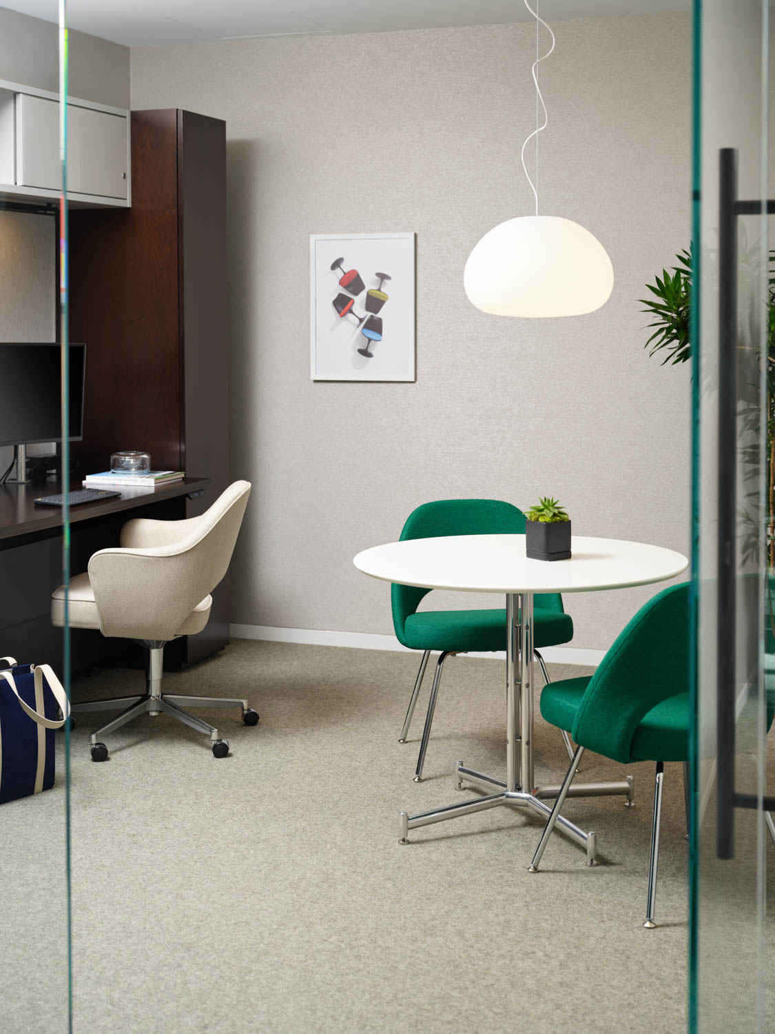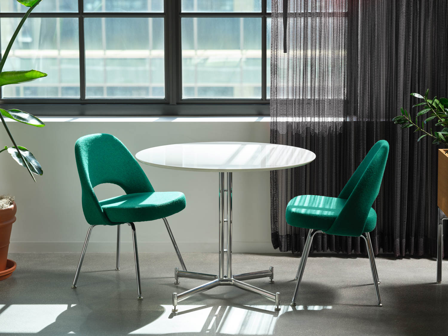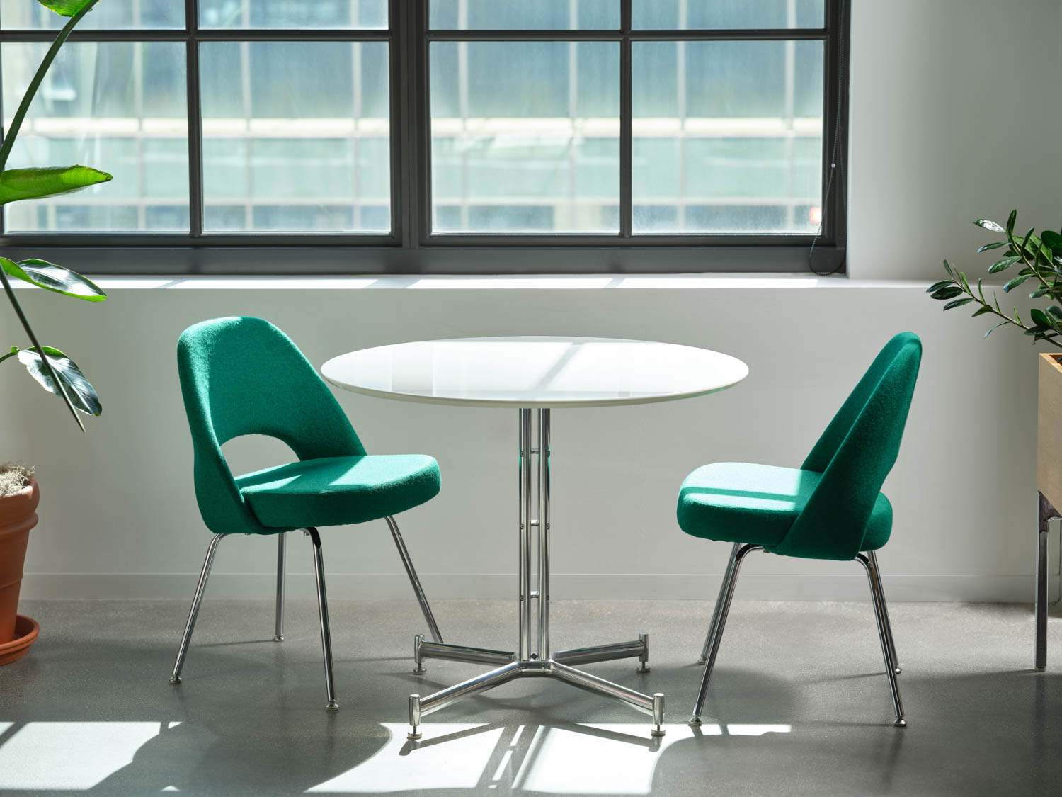 The Iquo Café Table features an elegant pedestal base, made of four vertical tubes, that provides wire management for power use and is intentionally flat where it meets the floor for comfortably resting your feet.