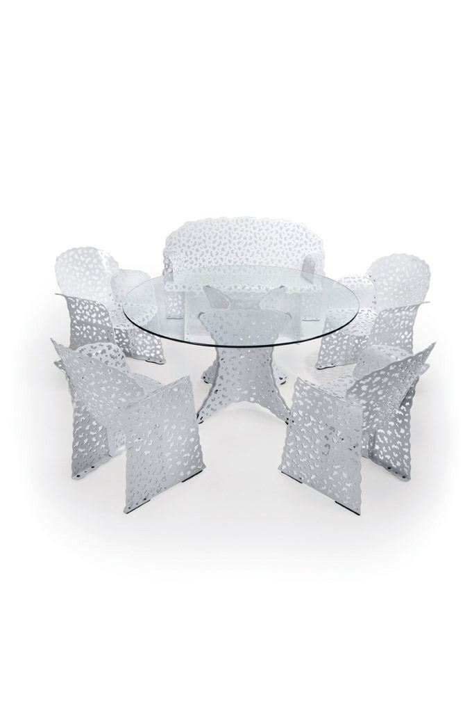 Richard Schultz designed the Topiary collection to look like shrubs pruned to look like furniture. The whimsical pieces act as light filters, disappearing into nature and creating patterns of dappled light on the ground below.
