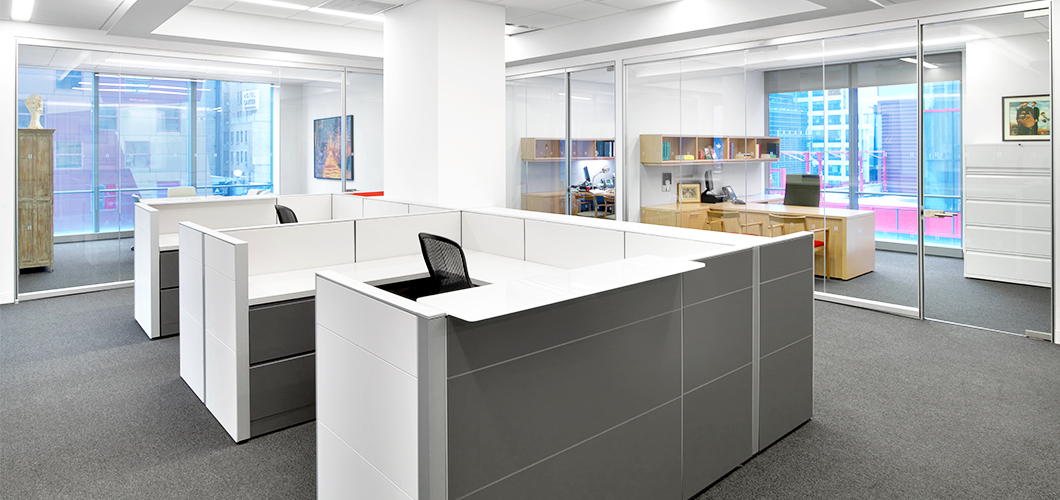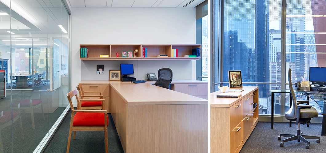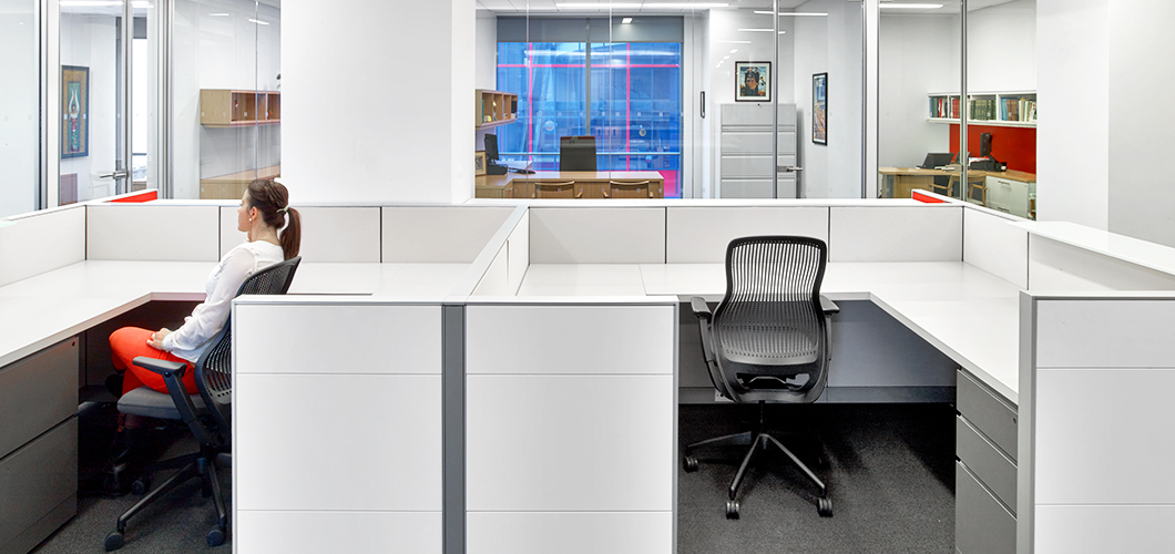 In the private perimeter offices, Reff Profiles was chosen for its transitional aesthetic and integrated technology support. Since both the private offices and the workstations would be visible at all times, the private office system had to be compatible with the clean lines of AutoStrada, while also projecting a more traditional and private space.