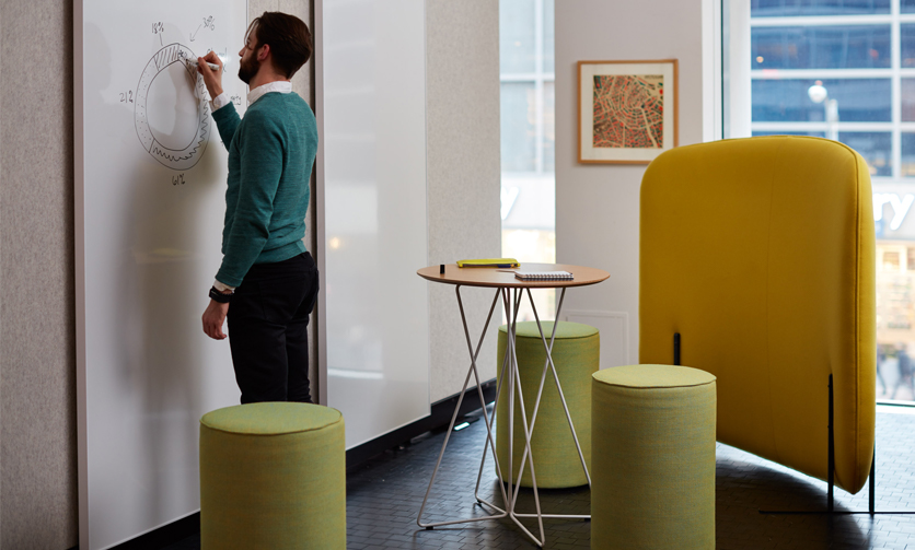 Perfect for meeting spaces and collaborative areas, communication boards and floorstanding screens provide an ideal way do define spaces for teams and groups. Support diverse team needs with sound-absorbing upholstered screens or communications boards that double as a collaboration tool to jot down brainstorms, presentations, and riffs of inspiration.